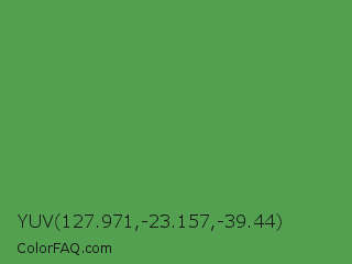 YUV 127.971,-23.157,-39.44 Color is a normal green color and the nearest color is Fruit Salad #4f9d5d. Hex code #53a051 and RGB value is rgb(83,160,81). In RGB color space, this color is composed of 33% red, 63% green, 32% blue, In CMYK color space, this color is composed of 48% cyan, 0% magenta, 49% yellow , 37% black , In HSL color space, this color has a hue angle of 118° , 33% saturation and 47% lightness.