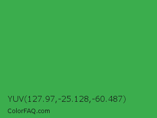 YUV 127.97,-25.128,-60.487 Color is a normal green color and the nearest color is Chateau Green #40a860. Hex code #3bad4d and RGB value is rgb(59,173,77). In RGB color space, this color is composed of 23% red, 68% green, 30% blue, In CMYK color space, this color is composed of 66% cyan, 0% magenta, 55% yellow , 32% black , In HSL color space, this color has a hue angle of 129° , 49% saturation and 45% lightness.