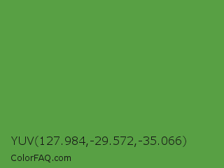 YUV 127.984,-29.572,-35.066 Color is a normal green color and the nearest color is Apple #4fa83d. Hex code #58a044 and RGB value is rgb(88,160,68). In RGB color space, this color is composed of 35% red, 63% green, 27% blue, In CMYK color space, this color is composed of 45% cyan, 0% magenta, 58% yellow , 37% black , In HSL color space, this color has a hue angle of 107° , 40% saturation and 45% lightness.