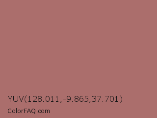 YUV 128.011,-9.865,37.701 Color is a normal red color and the nearest color is Copper Penny #ad6f69. Hex code #ab6e6c and RGB value is rgb(171,110,108). In RGB color space, this color is composed of 67% red, 43% green, 42% blue, In CMYK color space, this color is composed of 0% cyan, 36% magenta, 37% yellow , 33% black , In HSL color space, this color has a hue angle of 2° , 27% saturation and 55% lightness.