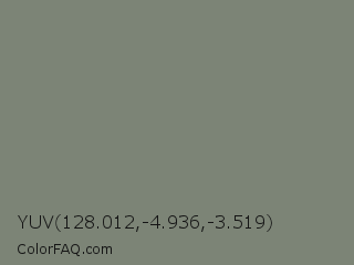 YUV 128.012,-4.936,-3.519 Color is a normal green color and the nearest color is Friar Gray #807e79. Hex code #7c8476 and RGB value is rgb(124,132,118). In RGB color space, this color is composed of 49% red, 52% green, 46% blue, In CMYK color space, this color is composed of 6% cyan, 0% magenta, 11% yellow , 48% black , In HSL color space, this color has a hue angle of 94° , 6% saturation and 49% lightness.