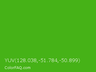 YUV 128.038,-51.784,-50.899 Color is a normal green color and the nearest color is Kelly Green #4cbb17. Hex code #46b217 and RGB value is rgb(70,178,23). In RGB color space, this color is composed of 27% red, 70% green, 9% blue, In CMYK color space, this color is composed of 61% cyan, 0% magenta, 87% yellow , 30% black , In HSL color space, this color has a hue angle of 102° , 77% saturation and 39% lightness.
