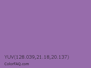 YUV 128.039,21.18,20.137 Color is a normal purple color and the nearest color is Wisteria #9771b5. Hex code #976cab and RGB value is rgb(151,108,171). In RGB color space, this color is composed of 59% red, 42% green, 67% blue, In CMYK color space, this color is composed of 12% cyan, 37% magenta, 0% yellow , 33% black , In HSL color space, this color has a hue angle of 281° , 27% saturation and 55% lightness.