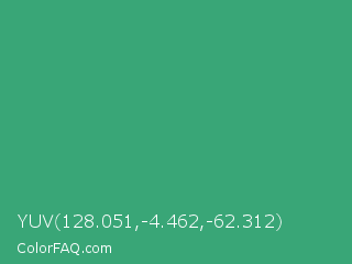 YUV 128.051,-4.462,-62.312 Color is a normal green color and the nearest color is Ocean Green #41aa78. Hex code #39a677 and RGB value is rgb(57,166,119). In RGB color space, this color is composed of 22% red, 65% green, 47% blue, In CMYK color space, this color is composed of 66% cyan, 0% magenta, 28% yellow , 35% black , In HSL color space, this color has a hue angle of 154° , 49% saturation and 44% lightness.