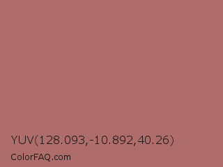 YUV 128.093,-10.892,40.26 Color is a normal red color and the nearest color is Copper Penny #ad6f69. Hex code #ae6d6a and RGB value is rgb(174,109,106). In RGB color space, this color is composed of 68% red, 43% green, 42% blue, In CMYK color space, this color is composed of 0% cyan, 37% magenta, 39% yellow , 32% black , In HSL color space, this color has a hue angle of 3° , 30% saturation and 55% lightness.