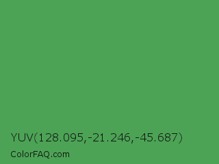 YUV 128.095,-21.246,-45.687 Color is a normal green color and the nearest color is Fruit Salad #4f9d5d. Hex code #4ca355 and RGB value is rgb(76,163,85). In RGB color space, this color is composed of 30% red, 64% green, 33% blue, In CMYK color space, this color is composed of 53% cyan, 0% magenta, 48% yellow , 36% black , In HSL color space, this color has a hue angle of 126° , 36% saturation and 47% lightness.
