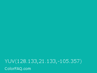 YUV 128.133,21.133,-105.357 Color is a normal cyan color and the nearest color is Tiffany Blue #0abab5. Hex code #08b5ab and RGB value is rgb(8,181,171). In RGB color space, this color is composed of 3% red, 71% green, 67% blue, In CMYK color space, this color is composed of 96% cyan, 0% magenta, 6% yellow , 29% black , In HSL color space, this color has a hue angle of 177° , 92% saturation and 37% lightness.
