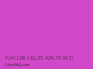YUV 128.142,35.426,70.912 Color is a normal magenta color and the nearest color is Fuchsia Pink #c154c1. Hex code #d149c8 and RGB value is rgb(209,73,200). In RGB color space, this color is composed of 82% red, 29% green, 78% blue, In CMYK color space, this color is composed of 0% cyan, 65% magenta, 4% yellow , 18% black , In HSL color space, this color has a hue angle of 304° , 60% saturation and 55% lightness.