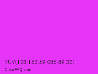 YUV 128.153,59.085,89.32 Color is a normal magenta color and the nearest color is Purple Pizzazz #fe4eda. Hex code #e635f8 and RGB value is rgb(230,53,248). In RGB color space, this color is composed of 90% red, 21% green, 97% blue, In CMYK color space, this color is composed of 7% cyan, 79% magenta, 0% yellow , 3% black , In HSL color space, this color has a hue angle of 294° , 93% saturation and 59% lightness.