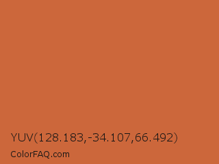 YUV 128.183,-34.107,66.492 Color is a normal orange color and the nearest color is Medium Vermilion #d9603b. Hex code #cc673b and RGB value is rgb(204,103,59). In RGB color space, this color is composed of 80% red, 40% green, 23% blue, In CMYK color space, this color is composed of 0% cyan, 50% magenta, 71% yellow , 20% black , In HSL color space, this color has a hue angle of 18° , 59% saturation and 52% lightness.