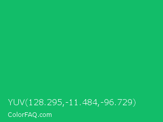 YUV 128.295,-11.484,-96.729 Color is a normal green color and the nearest color is Green Crayola #1cac78. Hex code #12bd69 and RGB value is rgb(18,189,105). In RGB color space, this color is composed of 7% red, 74% green, 41% blue, In CMYK color space, this color is composed of 90% cyan, 0% magenta, 44% yellow , 26% black , In HSL color space, this color has a hue angle of 151° , 83% saturation and 41% lightness.