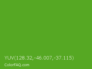 YUV 128.32,-46.007,-37.115 Color is a normal green color and the nearest color is Green RYB #66b032. Hex code #56a823 and RGB value is rgb(86,168,35). In RGB color space, this color is composed of 34% red, 66% green, 14% blue, In CMYK color space, this color is composed of 49% cyan, 0% magenta, 79% yellow , 34% black , In HSL color space, this color has a hue angle of 97° , 66% saturation and 40% lightness.