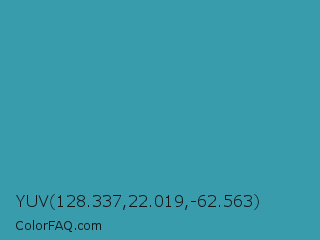 YUV 128.337,22.019,-62.563 Color is a normal cyan color and the nearest color is Boston Blue #3b91b4. Hex code #399cad and RGB value is rgb(57,156,173). In RGB color space, this color is composed of 22% red, 61% green, 68% blue, In CMYK color space, this color is composed of 67% cyan, 10% magenta, 0% yellow , 32% black , In HSL color space, this color has a hue angle of 189° , 50% saturation and 45% lightness.