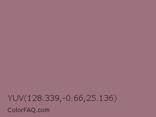 YUV 128.339,-0.66,25.136 Color is a normal rose color and the nearest color is Bazaar #98777b. Hex code #9d727f and RGB value is rgb(157,114,127). In RGB color space, this color is composed of 62% red, 45% green, 50% blue, In CMYK color space, this color is composed of 0% cyan, 27% magenta, 19% yellow , 38% black , In HSL color space, this color has a hue angle of 342° , 18% saturation and 53% lightness.