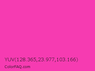 YUV 128.365,23.977,103.166 Color is a normal magenta color and the nearest color is Frostbite #e936a7. Hex code #f63bb1 and RGB value is rgb(246,59,177). In RGB color space, this color is composed of 96% red, 23% green, 69% blue, In CMYK color space, this color is composed of 0% cyan, 76% magenta, 28% yellow , 4% black , In HSL color space, this color has a hue angle of 322° , 91% saturation and 60% lightness.