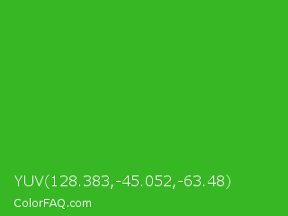 YUV 128.383,-45.052,-63.48 Color is a normal green color and the nearest color is Wageningen Green #34b233. Hex code #38b725 and RGB value is rgb(56,183,37). In RGB color space, this color is composed of 22% red, 72% green, 15% blue, In CMYK color space, this color is composed of 69% cyan, 0% magenta, 80% yellow , 28% black , In HSL color space, this color has a hue angle of 112° , 66% saturation and 43% lightness.