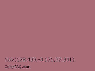 YUV 128.433,-3.171,37.331 Color is a normal red color and the nearest color is Rose Gold #b76e79. Hex code #ab6c7a and RGB value is rgb(171,108,122). In RGB color space, this color is composed of 67% red, 42% green, 48% blue, In CMYK color space, this color is composed of 0% cyan, 37% magenta, 29% yellow , 33% black , In HSL color space, this color has a hue angle of 347° , 27% saturation and 55% lightness.