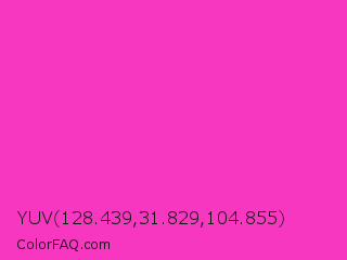 YUV 128.439,31.829,104.855 Color is a normal magenta color and the nearest color is Razzle Dazzle Rose #ff33cc. Hex code #f837c1 and RGB value is rgb(248,55,193). In RGB color space, this color is composed of 97% red, 22% green, 76% blue, In CMYK color space, this color is composed of 0% cyan, 78% magenta, 22% yellow , 3% black , In HSL color space, this color has a hue angle of 317° , 93% saturation and 59% lightness.