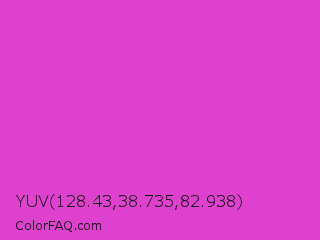YUV 128.43,38.735,82.938 Color is a normal magenta color and the nearest color is Steel Pink #cc33cc. Hex code #df41cf and RGB value is rgb(223,65,207). In RGB color space, this color is composed of 87% red, 25% green, 81% blue, In CMYK color space, this color is composed of 0% cyan, 71% magenta, 7% yellow , 13% black , In HSL color space, this color has a hue angle of 306° , 71% saturation and 56% lightness.