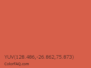 YUV 128.486,-26.862,75.873 Color is a normal red color and the nearest color is Jelly Bean #da614e. Hex code #d75f4a and RGB value is rgb(215,95,74). In RGB color space, this color is composed of 84% red, 37% green, 29% blue, In CMYK color space, this color is composed of 0% cyan, 56% magenta, 66% yellow , 16% black , In HSL color space, this color has a hue angle of 9° , 64% saturation and 57% lightness.