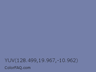 YUV 128.499,19.967,-10.962 Color is a normal blue color and the nearest color is Shadow Blue #778ba5. Hex code #747fa9 and RGB value is rgb(116,127,169). In RGB color space, this color is composed of 45% red, 50% green, 66% blue, In CMYK color space, this color is composed of 31% cyan, 25% magenta, 0% yellow , 34% black , In HSL color space, this color has a hue angle of 228° , 24% saturation and 56% lightness.