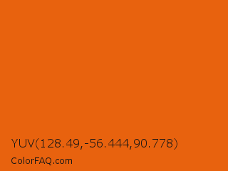 YUV 128.49,-56.444,90.778 Color is a normal orange color and the nearest color is Spanish Orange #e86100. Hex code #e8620e and RGB value is rgb(232,98,14). In RGB color space, this color is composed of 91% red, 38% green, 5% blue, In CMYK color space, this color is composed of 0% cyan, 58% magenta, 94% yellow , 9% black , In HSL color space, this color has a hue angle of 23° , 89% saturation and 48% lightness.