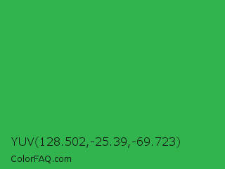 YUV 128.502,-25.39,-69.723 Color is a normal green color and the nearest color is Wageningen Green #34b233. Hex code #31b34d and RGB value is rgb(49,179,77). In RGB color space, this color is composed of 19% red, 70% green, 30% blue, In CMYK color space, this color is composed of 73% cyan, 0% magenta, 57% yellow , 30% black , In HSL color space, this color has a hue angle of 133° , 57% saturation and 45% lightness.