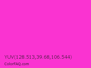 YUV 128.513,39.68,106.544 Color is a normal magenta color and the nearest color is Razzle Dazzle Rose #ff33cc. Hex code #fa33d1 and RGB value is rgb(250,51,209). In RGB color space, this color is composed of 98% red, 20% green, 82% blue, In CMYK color space, this color is composed of 0% cyan, 80% magenta, 16% yellow , 2% black , In HSL color space, this color has a hue angle of 312° , 95% saturation and 59% lightness.