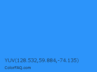 YUV 128.532,59.884,-74.135 Color is a normal blue color and the nearest color is Brilliant Azure #3399ff. Hex code #2c94fa and RGB value is rgb(44,148,250). In RGB color space, this color is composed of 17% red, 58% green, 98% blue, In CMYK color space, this color is composed of 82% cyan, 41% magenta, 0% yellow , 2% black , In HSL color space, this color has a hue angle of 210° , 95% saturation and 58% lightness.