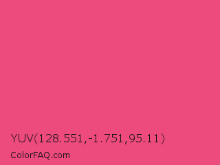 YUV 128.551,-1.751,95.11 Color is a light rose color and the nearest color is Dark Pink #e75480. Hex code #ed4a7d and RGB value is rgb(237,74,125). In RGB color space, this color is composed of 93% red, 29% green, 49% blue, In CMYK color space, this color is composed of 0% cyan, 69% magenta, 47% yellow , 7% black , In HSL color space, this color has a hue angle of 341° , 82% saturation and 61% lightness.