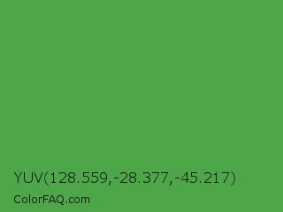 YUV 128.559,-28.377,-45.217 Color is a normal green color and the nearest color is Apple #4fa83d. Hex code #4da647 and RGB value is rgb(77,166,71). In RGB color space, this color is composed of 30% red, 65% green, 28% blue, In CMYK color space, this color is composed of 54% cyan, 0% magenta, 57% yellow , 35% black , In HSL color space, this color has a hue angle of 116° , 40% saturation and 46% lightness.