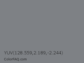 YUV 128.559,2.189,-2.244 Color is a normal blue color and the nearest color is Gray #808080. Hex code #7e8185 and RGB value is rgb(126,129,133). In RGB color space, this color is composed of 49% red, 51% green, 52% blue, In CMYK color space, this color is composed of 5% cyan, 3% magenta, 0% yellow , 48% black , In HSL color space, this color has a hue angle of 214° , 3% saturation and 51% lightness.