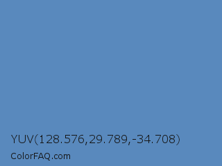 YUV 128.576,29.789,-34.708 Color is a normal blue color and the nearest color is Silver Lake Blue #5d89ba. Hex code #5989bd and RGB value is rgb(89,137,189). In RGB color space, this color is composed of 35% red, 54% green, 74% blue, In CMYK color space, this color is composed of 53% cyan, 28% magenta, 0% yellow , 26% black , In HSL color space, this color has a hue angle of 211° , 43% saturation and 55% lightness.