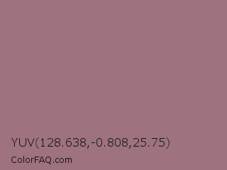 YUV 128.638,-0.808,25.75 Color is a normal rose color and the nearest color is Bazaar #98777b. Hex code #9e727f and RGB value is rgb(158,114,127). In RGB color space, this color is composed of 62% red, 45% green, 50% blue, In CMYK color space, this color is composed of 0% cyan, 28% magenta, 20% yellow , 38% black , In HSL color space, this color has a hue angle of 342° , 18% saturation and 53% lightness.