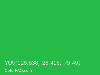 YUV 128.638,-28.416,-79.49 Color is a normal green color and the nearest color is Wageningen Green #34b233. Hex code #26ba47 and RGB value is rgb(38,186,71). In RGB color space, this color is composed of 15% red, 73% green, 28% blue, In CMYK color space, this color is composed of 80% cyan, 0% magenta, 62% yellow , 27% black , In HSL color space, this color has a hue angle of 133° , 66% saturation and 44% lightness.