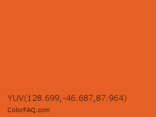 YUV 128.699,-46.687,87.964 Color is a normal orange color and the nearest color is Vivid Vermilion #e56024. Hex code #e56022 and RGB value is rgb(229,96,34). In RGB color space, this color is composed of 90% red, 38% green, 13% blue, In CMYK color space, this color is composed of 0% cyan, 58% magenta, 85% yellow , 10% black , In HSL color space, this color has a hue angle of 19° , 79% saturation and 52% lightness.