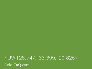 YUV 128.747,-33.399,-20.826 Color is a normal green color and the nearest color is Palm Leaf #6f9940. Hex code #699a3d and RGB value is rgb(105,154,61). In RGB color space, this color is composed of 41% red, 60% green, 24% blue, In CMYK color space, this color is composed of 32% cyan, 0% magenta, 60% yellow , 40% black , In HSL color space, this color has a hue angle of 92° , 43% saturation and 42% lightness.