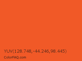 YUV 128.748,-44.246,98.445 Color is a normal color and the nearest color is Flamingo #f2552a. Hex code #f15927 and RGB value is rgb(241,89,39). In RGB color space, this color is composed of 95% red, 35% green, 15% blue, In CMYK color space, this color is composed of 0% cyan, 63% magenta, 84% yellow , 5% black , In HSL color space, this color has a hue angle of 15° , 88% saturation and 55% lightness.
