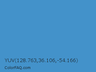 YUV 128.763,36.106,-54.166 Color is a normal blue color and the nearest color is Celestial Blue #4997d0. Hex code #4392ca and RGB value is rgb(67,146,202). In RGB color space, this color is composed of 26% red, 57% green, 79% blue, In CMYK color space, this color is composed of 67% cyan, 28% magenta, 0% yellow , 21% black , In HSL color space, this color has a hue angle of 205° , 56% saturation and 53% lightness.