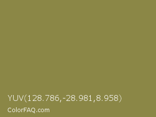 YUV 128.786,-28.981,8.958 Color is a normal yellow color and the nearest color is Dark Tan #918151. Hex code #8b8746 and RGB value is rgb(139,135,70). In RGB color space, this color is composed of 55% red, 53% green, 27% blue, In CMYK color space, this color is composed of 0% cyan, 3% magenta, 50% yellow , 45% black , In HSL color space, this color has a hue angle of 57° , 33% saturation and 41% lightness.