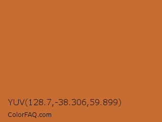 YUV 128.7,-38.306,59.899 Color is a normal orange color and the nearest color is Copper #b87333. Hex code #c56d33 and RGB value is rgb(197,109,51). In RGB color space, this color is composed of 77% red, 43% green, 20% blue, In CMYK color space, this color is composed of 0% cyan, 45% magenta, 74% yellow , 23% black , In HSL color space, this color has a hue angle of 24° , 59% saturation and 49% lightness.