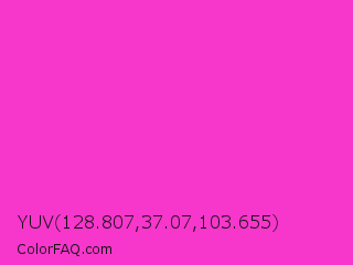 YUV 128.807,37.07,103.655 Color is a normal magenta color and the nearest color is Razzle Dazzle Rose #ff33cc. Hex code #f736cc and RGB value is rgb(247,54,204). In RGB color space, this color is composed of 97% red, 21% green, 80% blue, In CMYK color space, this color is composed of 0% cyan, 78% magenta, 17% yellow , 3% black , In HSL color space, this color has a hue angle of 313° , 92% saturation and 59% lightness.