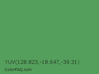 YUV 128.823,-18.647,-39.31 Color is a normal green color and the nearest color is Fruit Salad #4f9d5d. Hex code #549f5b and RGB value is rgb(84,159,91). In RGB color space, this color is composed of 33% red, 62% green, 36% blue, In CMYK color space, this color is composed of 47% cyan, 0% magenta, 43% yellow , 38% black , In HSL color space, this color has a hue angle of 126° , 31% saturation and 48% lightness.