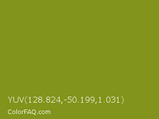 YUV 128.824,-50.199,1.031 Color is a normal yellow color and the nearest color is Trendy Green #7c881a. Hex code #82941b and RGB value is rgb(130,148,27). In RGB color space, this color is composed of 51% red, 58% green, 11% blue, In CMYK color space, this color is composed of 12% cyan, 0% magenta, 82% yellow , 42% black , In HSL color space, this color has a hue angle of 69° , 69% saturation and 34% lightness.
