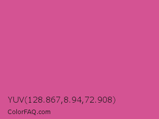 YUV 128.867,8.94,72.908 Color is a normal rose color and the nearest color is Pink Pantone #d74894. Hex code #d45393 and RGB value is rgb(212,83,147). In RGB color space, this color is composed of 83% red, 33% green, 58% blue, In CMYK color space, this color is composed of 0% cyan, 61% magenta, 31% yellow , 17% black , In HSL color space, this color has a hue angle of 330° , 60% saturation and 58% lightness.