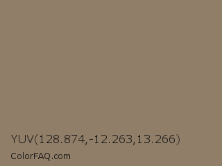 YUV 128.874,-12.263,13.266 Color is a normal orange color and the nearest color is Makara #897d6d. Hex code #907e68 and RGB value is rgb(144,126,104). In RGB color space, this color is composed of 56% red, 49% green, 41% blue, In CMYK color space, this color is composed of 0% cyan, 13% magenta, 28% yellow , 44% black , In HSL color space, this color has a hue angle of 33° , 16% saturation and 49% lightness.