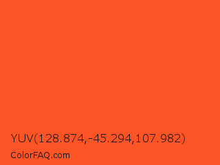 YUV 128.874,-45.294,107.982 Color is a normal red color and the nearest color is Giants Orange #fe5a1d. Hex code #fc5425 and RGB value is rgb(252,84,37). In RGB color space, this color is composed of 99% red, 33% green, 15% blue, In CMYK color space, this color is composed of 0% cyan, 67% magenta, 85% yellow , 1% black , In HSL color space, this color has a hue angle of 13° , 97% saturation and 57% lightness.