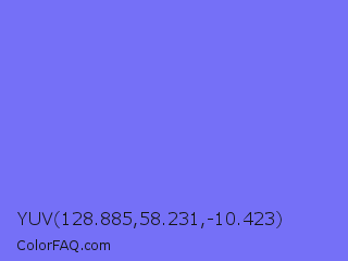 YUV 128.885,58.231,-10.423 Color is a light indigo color and the nearest color is Medium Slate Blue #7b68ee. Hex code #7570f7 and RGB value is rgb(117,112,247). In RGB color space, this color is composed of 46% red, 44% green, 97% blue, In CMYK color space, this color is composed of 53% cyan, 55% magenta, 0% yellow , 3% black , In HSL color space, this color has a hue angle of 242° , 89% saturation and 70% lightness.