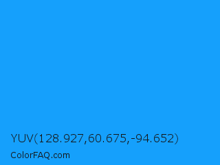 YUV 128.927,60.675,-94.652 Color is a normal blue color and the nearest color is Dodger Blue #1e90ff. Hex code #15a0fc and RGB value is rgb(21,160,252). In RGB color space, this color is composed of 8% red, 63% green, 99% blue, In CMYK color space, this color is composed of 92% cyan, 37% magenta, 0% yellow , 1% black , In HSL color space, this color has a hue angle of 204° , 97% saturation and 54% lightness.