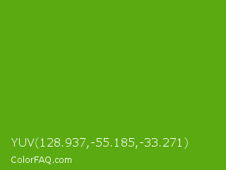 YUV 128.937,-55.185,-33.271 Color is a normal green color and the nearest color is Christi #67a712. Hex code #5baa11 and RGB value is rgb(91,170,17). In RGB color space, this color is composed of 36% red, 67% green, 7% blue, In CMYK color space, this color is composed of 46% cyan, 0% magenta, 90% yellow , 33% black , In HSL color space, this color has a hue angle of 91° , 82% saturation and 37% lightness.